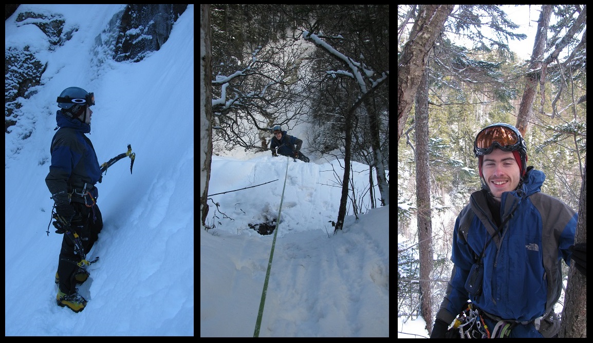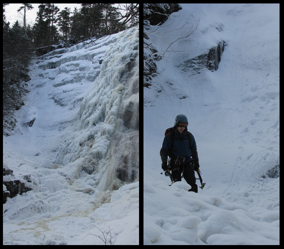 falls I found good sticks and was able to pull myself up and over to the safety of a tree to build our belay. Climbing a frozen (semi-frozen) waterfall is fun, but the real fun begins as that wet frozen hand comes back to warm-blooded life. Kevin is on belay and meets me at the top a few minutes later. There’s that smile again.